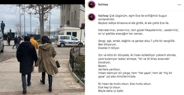 Say, "Çok üzgünüm, eşim Ece ile evliliğimizi bugün sonlandırdık. Beykoz Adliye binasına el ele girdik, el ele çıktık Ece ile. Hatıralarımızı, anılarımızı, tüm güzel hikayelerimizi, seslerimizi, en iyi şekilde anacağım her zaman. Sevgi, aşk, emek, bağlılık ve şevkat dolu 7 yıllık bir sevgililik. Ben biliyorum. Dostlarım biliyor. Zor ve kötü bir dünyada, iki insan ezilebiliyor yüklerin altında, çare bulamıyor tedavi etmeye, 'bir ve iki birey arasında' bocalıyor. Bazen, dertlere yeniliyor, imkan olamıyor bir çıkışa, hem 'her şeye' hem de 'hiçbir şeye' yol alan ömürlerimizde. İki insan da mutlu olsun, Ece mutlu olsun."