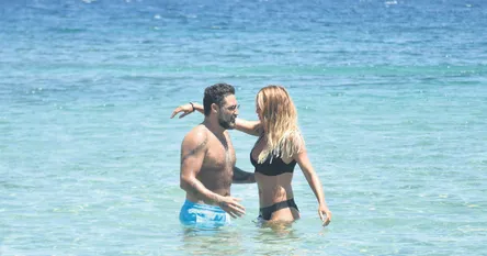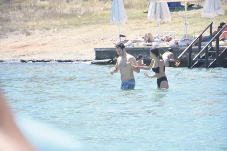 Bozcaada'dakıi yaz festivaline katılan oyuncu Aleyna Solaker'e, sevgilisi Berk Boyacıgil eşlik etti. Denizin soğuk olduğunu gören Solaker, uzun süre iskelede bekledi. Boyacıgil, dakikalarca uğraştıktan sonra sevgilisini denize girmeye ikna etti.