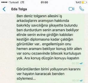 Olay savcılığa intikal edip ben Tolga'nın şahidi olunca, diğer bir şahidine yaptığı gibi, beni de bu mesajı atmamdan iki-üç ay sonra savcılığa şikayet etti. Kesinlikle kendisini tehdit etmedim. Mesajın orijinal halini size yolluyorum ve herkesin vicdanına bırakıyorum.