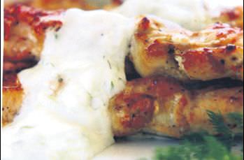 Tavuk etini kuşbaşı doğrayın. Sıvıyağı bir kaba alıp, sarmısak, kimyon, kişniş ve pulbiberi ekleyip, karıştırın. Etleri çöp şişlere dizin, üzerine sarmısaklı karışımı gezdirin. Buzdolabında iki saat dinlendirin. Sos için, yoğurt ve limon suyunu karıştırın. Rendelenip suyu sıkılmış salatalık, dereotu, hardal, bal, karabiber ve tuzu ilave edip, iyice karıştırın. Eti ızgarada önlü arkalı kızartıp, sosla servis yapın.