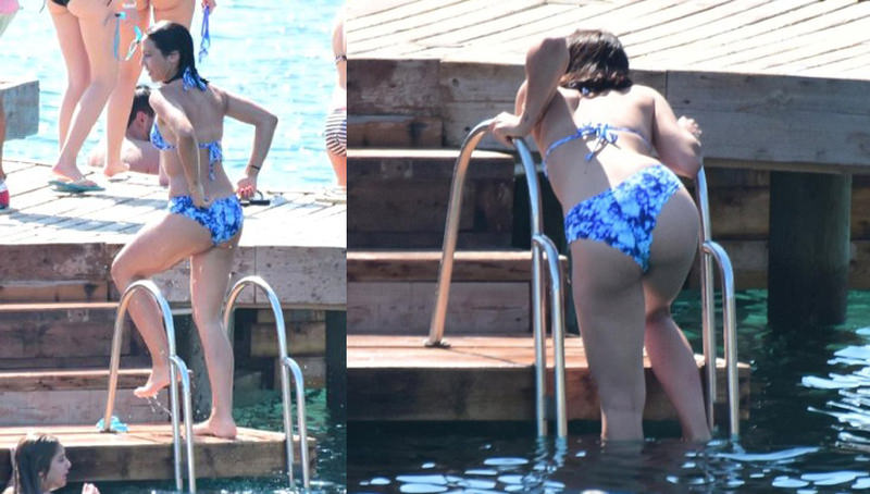 Arkadaşıyla iskelede görüntülenen Zehra muhabirleri fark edince, havluya sarınıp koşar adım giyinme kabinlerine doğru kaçtı.