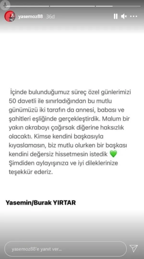 Malum bir yakın akrabayı çağırsak diğerine haksızlık olacaktı. Kimse kendini başkasıyla kıyaslamasın, biz mutlu olurken bir başkası kendini değersiz hissetmesin istedik. Şimdiden anlayışınıza ve iyi dilekleriniz teşekkür ederiz" ifadelerini kullandı.