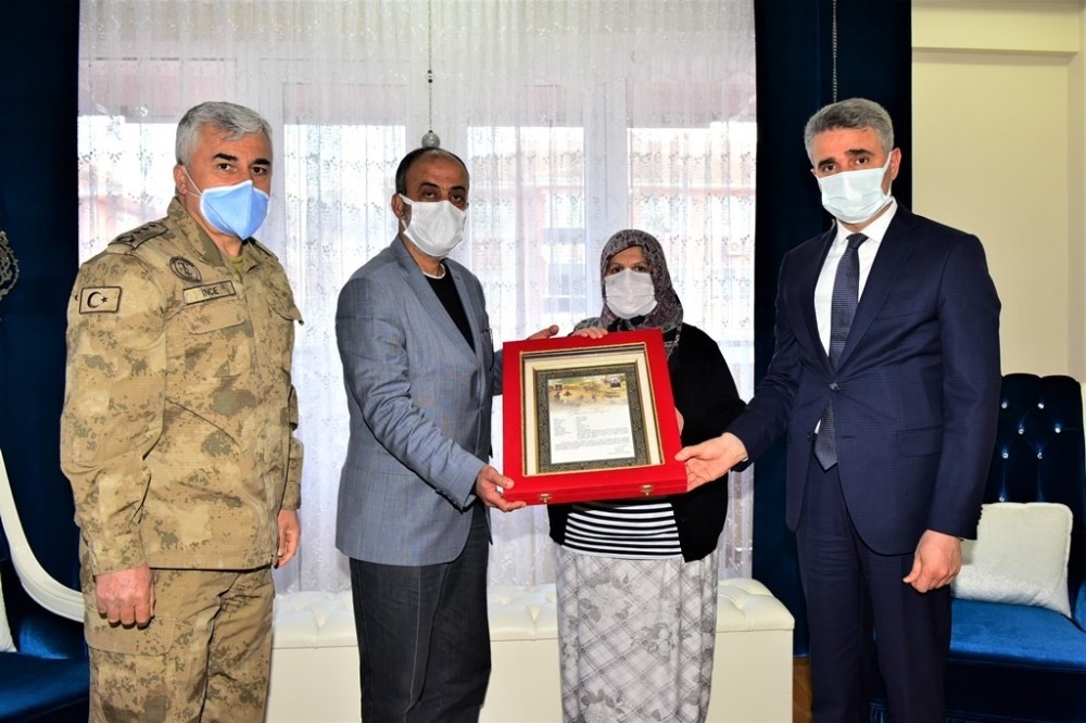 İl Jandarma Komutanı İnce de Jandarma Genel Komutanlığınca hazırlanan Taziye Mesajı ve Hizmet Anısını şehidin babası Gürsel Özbey’e takdim ederek, başsağlığı diledi.