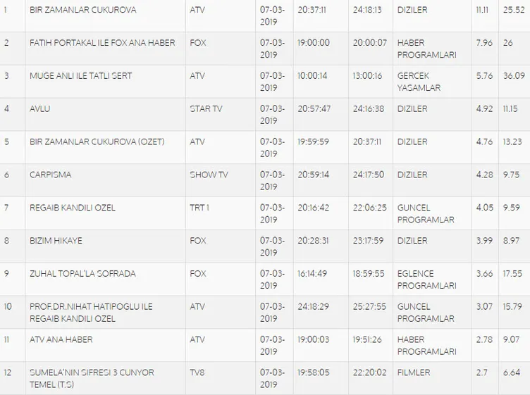 7 Mart Perşembe reyting sonuçlarında TOTAL kategorisinde Bir Zamanlar Çukurova; 11.87 reyting puanı ile ilk sırada yer aldı, Müge Anlı ile Tatlı Sert 5.83 reyting puanı ile 3. sırada yer alırken, Avlu 5. sırada Çarpışma ise 3.09 ile 14. oldu.