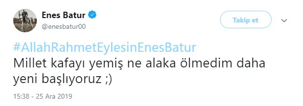 11 buçuk milyon takipçisiyle Youtube'da en çok takipçi sayısını elinde bulunduran Enes Batur hakkında bugün şoke eden mesajlar yayımlandı. Twitter kullanıcıları "Allah rahmet eylesin Enes Batur" diye birçok tweet attı. Bu gelişme sonrası özellikle ünlü Youtuberın hayranları "Enes Batur Öldü mü?" sorusunu sormaya başladı. Bunun üzerine ünlü fenomen kendi sosyal medya hesabından iddiaları yalanladı…