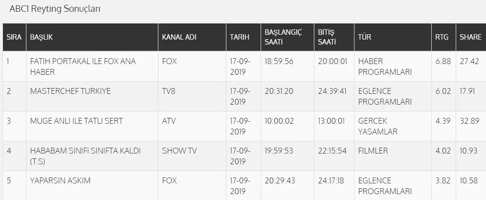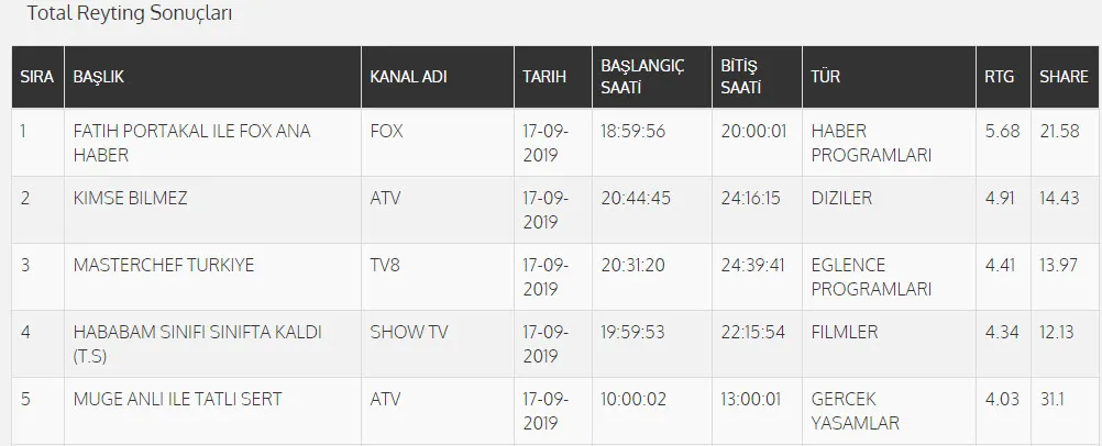 Eylül ayına girdiğimiz şu dönemde sezon finali yapan dizilerin yeni sezon için başlaması, yaz dizilerinin devam etmesi ve yeni programların ekranlarda olması rekabeti giderek arttırıyor. Her kanalda ayrı bir program ve dizinin olması vatandaşlar için çeşitlilik ve alternatif sağlarken aynı zamanda bu durum heyecan yaratmakta. Güncel olarak "Reyting sonuçları açıklandı mı?" sorusuna yanıt arayan vatandaşlar izledikleri dizinin de birinci olmasını istiyorlar. Bu bakımdan; reyting sonuçları açıklandI. 17 Eylül reyting sonuçlarına göre birinci kim oldu?