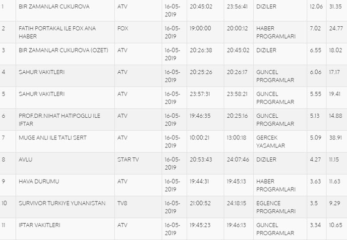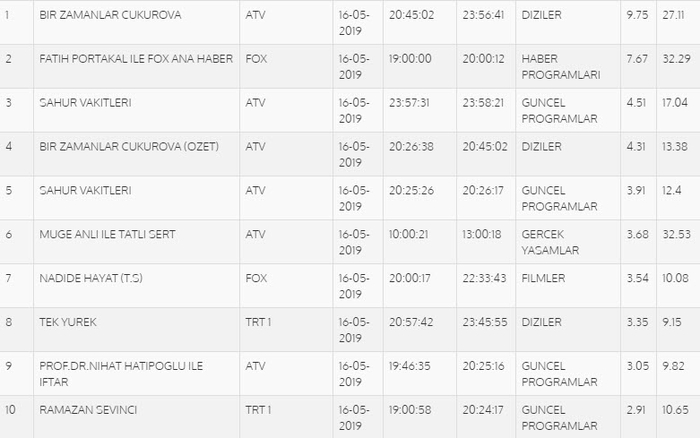 16 Mayıs Perşembe TOTAL reyting sonuçlarında da Bir Zamanlar Çukurova 12.06 reyting puanı ile birinci sırada yer aldı. Bir Zamanlar Çukurova'nın özeti 3. olurken Sahur Vakitleri programı 4. sırada yer aldı. Avlu 4.27 reyting puanıyla 8. oldu. Show TV'de yayınlanan Çarpışma dizisi de 2.24 reyting puanıyla 26. sırada yer aldı.