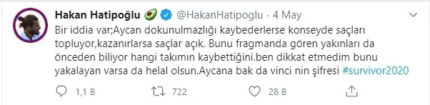 "Bir iddia var;Aycan dokunulmazlığı kaybederlerse konseyde saçları topluyor,kazanırlarsa saçlar açık. Bunu fragmanda gören yakınları da önceden biliyor hangi takımın kaybettiğini.ben dikkat etmedim bunu yakalayan varsa da helal olsun.Aycana bak da vinci nin şifresi #survivor2020"