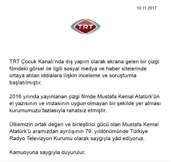 "TRT Çocuk Kanalında dış yapım olarak ekrana gelen bir çizgi filmdeki görselle ilgili sosyal medyada ve haber sitelerinde ortaya atılan iddialara ilişkin soruşturma başlatılmıştır. 2016 yılında yayınlanan çizgi filmde Mustafa Kemal Atatürk'ün el yazısının ve imzasının uygun olmayan bir şekilde yer alması kurumumuzu fazlasıyla rahatsız etmiştir"