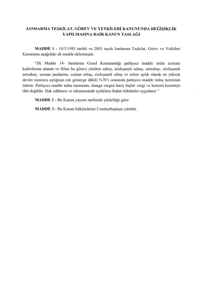 Jandarma Genel Komutanlığında çalışan askeri personele müjde ! Hazırlanan taslağa göre; Jandarma Genel Komutanlığında patlayıcı madde uzmanı kadrolarına atanan ve bu görevi fiilen yürüten subay, sözleşmeli subay, sözleşmeli astsubay, uzman jandarma, sözleşmeli erbaş ve erlere ey yüksek devlet memuru aylığının %70 oranında patlayıcı madde tazminatı ödenmesi öngörülüyor. Taslağın kısa zamanda yasalaşması bekleniyor.