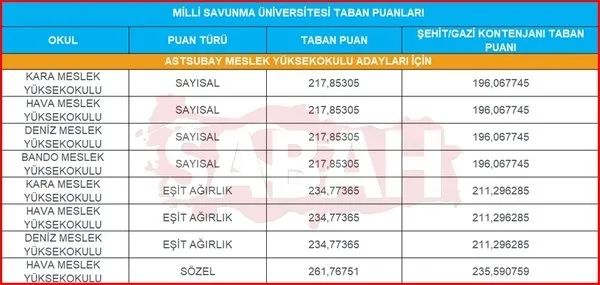 MSB tarafından belirlenecek olan taban puanı alamamış olan adayların, 2'nci seçim aşamalarına katılmış ve başarılı olmuş olsalar dahi taban puanını alamadıkları okul türü için askeri öğrenci adaylıkları sonlandırılır.