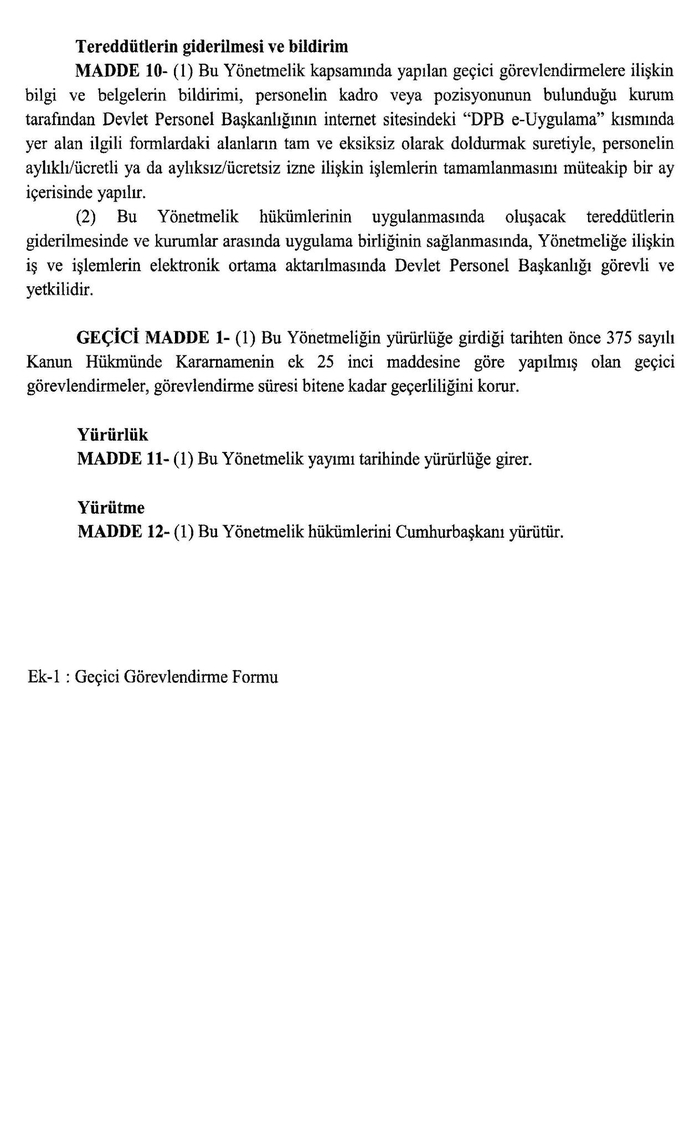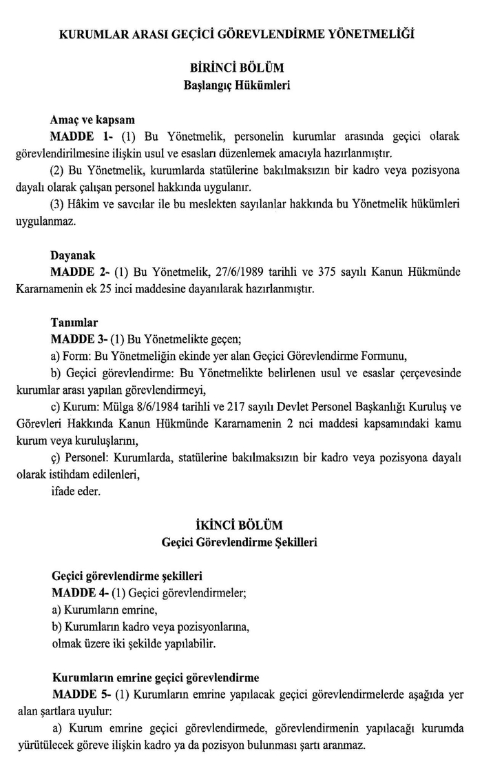 Türkiye Cumhurbaşkanı Recep Tayyip Erdoğan imzasıyla yayımlanan yönetmelik, hakim ve savcılar hariç olmak üzere, statülerine bakılmaksızın bir kadro veya pozisyona dayalı olarak çalışan personeli kapsıyor. Buna göre, kurum emrine geçici görevlendirmelerde, görevlendirmenin yapılacağı kurumda yürütülecek göreve ilişkin kadro ya da pozisyon bulunması şartı aranmayacak.