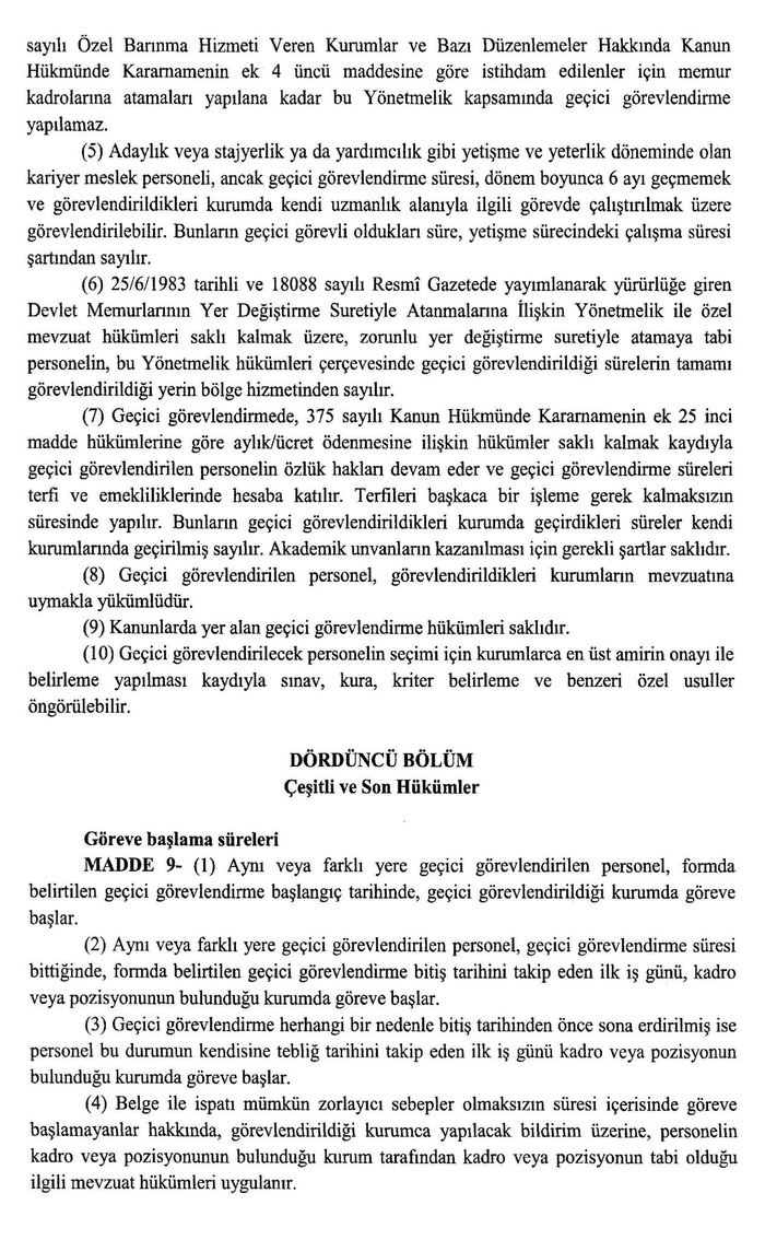 Ancak adaylık, stajyerlik ya da yardımcılık gibi yetişme ve yeterlik döneminde olan kariyer meslek personeli, geçici görevlendirme süresi dönem boyunca 6 ayı geçmemek ve görevlendirildikleri kurumda kendi uzmanlık alanıyla ilgili görevde çalıştırılmak üzere görevlendirilebilecek. Bu kişilerin geçici görevli oldukları süre, yetişme sürecindeki çalışma süresi şartından sayılacak.