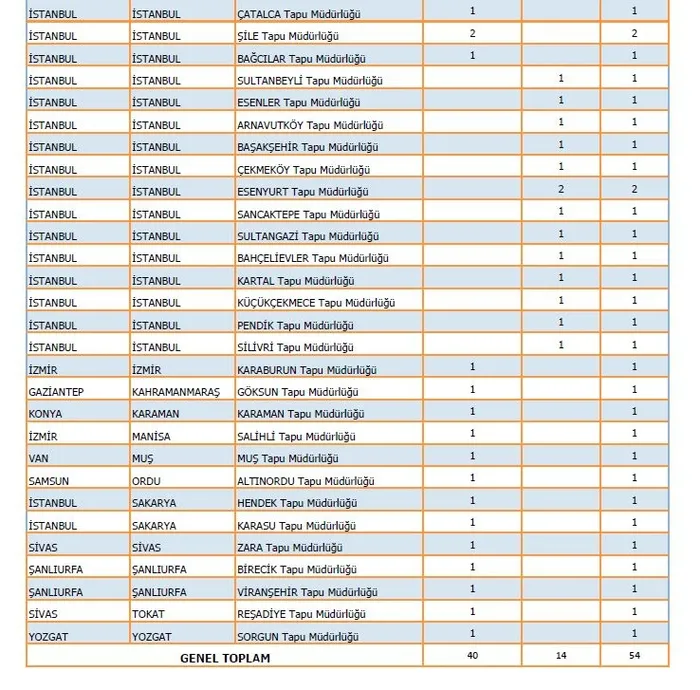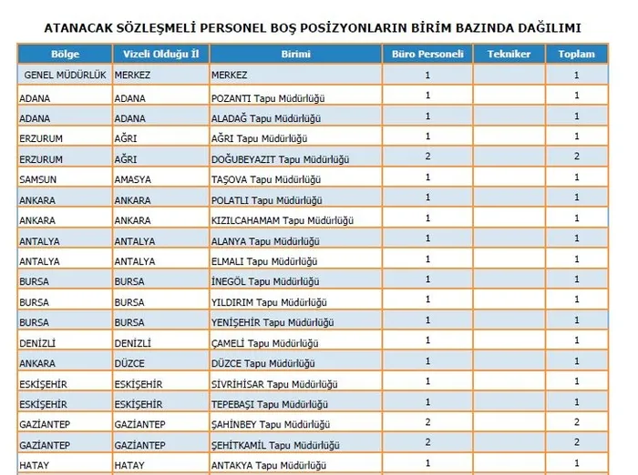 Tapu ve Kadastro Genel Müdürlüğüne bağlı Tapu Müdürlüklerinde 657 sayılı Devlet Memurları Kanununun 4 üncü maddesinin (B) fıkrası kapsamında istihdam edilmek üzere 06/06/1978 tarihli ve 7/15754 sayılı Bakanlar Kurulu Kararına ekli 28/06/1978 tarihli ve 16330 sayılı Resmi Gazete'de yayımlanan Sözleşmeli Personel Çalıştırılmasına İlişkin Esasların Ek-2 nci maddesinin birinci fıkrasının (a) bendine göre Ölçme, Seçme ve Yerleştirme Merkezi Başkanlığı (ÖSYM) Başkanlığı tarafından Kamu Personeli Seçme Sınavı (KPSS) (B) grubu puan sıralaması esas alınmak suretiyle doğrudan yapılacak merkezi yerleştirme yöntemi ile 57 adet Büro Personeli ve 68 adet Tekniker unvanında olmak üzere toplam 125 (yüzyirmibeş) adet sözleşmeli personel alınacaktır.