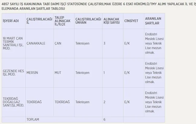 4- Eski Hükümlü veya Terör mağduru kontenjanında başvuracaklar için Tehlikeli ve Çok Tehlikeli işlerde ve vardiyalı hizmetlerde çalışmasına mani bir sağlık problemi bulunmaması,