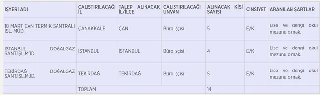Şirketimiz Çanakkale, İstanbul ve Tekirdağ illerindeki işyerimize 4857 sayılı İş Kanununun 30.maddesi kapsamında toplam 14 Engelli daimi işçi alımı yapılacaktır. Türkiye İş Kurumu Çankaya Hizmet Merkezi Şube Müdürlüğünce yayınlanacak ilanda aranılan şartları taşıyan istekliler, son başvuru tarihine kadar Çalışma ve İş Kurumu Genel Müdürlüğü kanalıyla adaylık başvurusunda bulunabilirler.