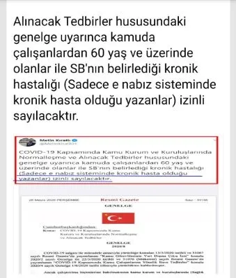 Yayınlanan Cumhurbaşkanlığı genelgesine göre Sağlık Bakanlığının belirlediği kronik hastalar idari izinli sayılacak. İdari izinde olan, bu sürede görevlerini yerine getirmiş sayılacak.