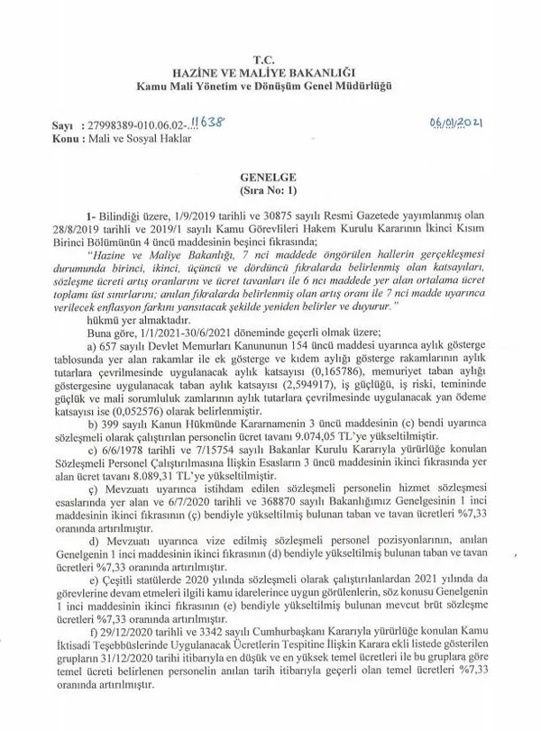 Hazine ve Maliye Bakanlığı kamu çalışanlarının mali ve sosyal haklarıyla ilgili bilgiler ile tazminattan asgari ücrete artış oranlarını içeren genelgeyi yayınladı. Genelgede kıdem tazminatı tavan ücreti, brüt asgari ücret ve kamu personelinin tavan ücretleriyle ilgili bilgiler de yer aldı. İşte Hazine ve Maliye Bakanı Lütfi Elvan imzasıyla yayınlanan o genelge:
