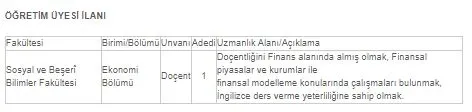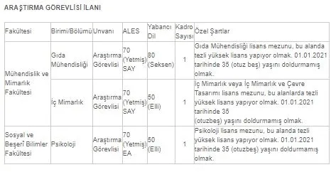 Konya Gıda ve Tarım Üniversitesi 4 akademik personel alacağını açıkladı. Basın İlan Kurumu ilan portalı ilan. gov.tr'de yer alan duyuruda, "Üniversitemiz ilgili birimlerine 2547 sayılı Kanun ve 12.06.2018 tarih ve 30449 sayılı Resmi Gazetede yayımlanarak yürürlüğe giren "Öğretim Üyeliğine Yükseltilme ve Atanma Yönetmeliğinin" ilgili maddeleri uyarınca belirli süreli statüde 1 (bir) adet öğretim üyesi (Doçent); 09.11.2018 tarih ve 30590 sayılı Resmî Gazetede yayımlanarak yürürlüğe giren "Öğretim Üyesi Dışındaki Öğretim Elemanları Kadrolarına Yapılacak Atamalarda Uygulanacak Merkezi Sınav ile Giriş Sınavlarına İlişkin Usul ve Esaslar Hakkında Yönetmeliğinin" ilgili maddeleri uyarınca 3 (üç) adet Araştırma Görevlisi olmak üzere 4 (dört) adet öğretim elemanı alınacaktır" denildi ve detaylar sıralandı.