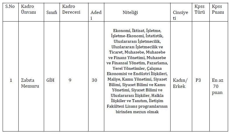 "Fatih Belediye Başkanlığı bünyesinde 657 sayılı Devlet Memurları Kanununa tabi olarak istihdam edilmek üzere, Belediye Zabıta Yönetmeliği hükümlerine göre aşağıda yer alan unvanı, sınıfı, derecesi, adedi, nitelikleri, KPSS türü, KPSS taban puanı ve diğer şartları taşımak kaydı ile belirtilen boş kadrolara açıktan atama yoluyla zabıta memuru alınacaktır."