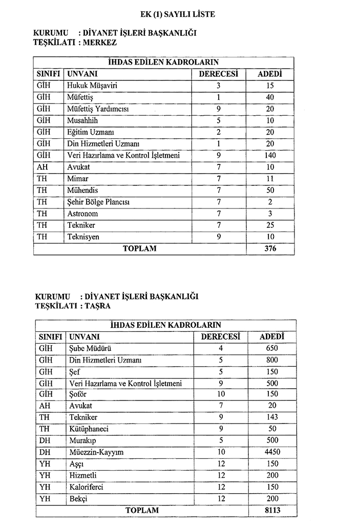 Buna göre, merkez teşkilatına hukuk müşaviri (15), müfettiş (40), müfettiş yardımcısı (20), musahhih (10), eğitim uzmanı (20), din hizmetleri uzmanı (20), veri hazırlama ve kontrol işletmeni (140), avukat (10), mimar (11), mühendis (50), şehir bölge planlamacısı (2), astronom (3), tekniker (25) ve teknisyen (10) olmak üzere toplam 376 kadro ihdası gerçekleştirildi.