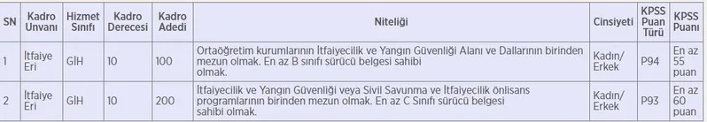 - Ortaöğretim kurumlarının İtfaiyecilik ve Yangın Güvenliği Alanı ve Dallarının birinden mezun olan adayların başvuru yapacağı kadrolar için itfaiye teşkilatının ihtiyacına göre belirlenen, 13/10/1983 tarihli ve 2918 sayılı Karayolları Trafik Kanunu hükümlerince verilen en az B sınıfı sürücü belgesine sahip olmak,