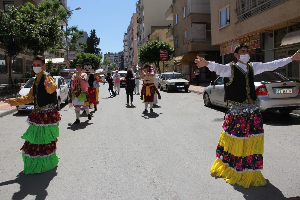 MERSİN (İHA) – Mersin’in Nusratiye Mahallesi sakinleri, bayram sürpriziyle neşelendi. Korona virüs önlemleri kapsamında bu yıl sokağa çıkma kısıtlaması nedeniyle evlerinden çıkamayan vatandaşlar, Mahalle Muhtarı Mehmet Dindar’ın bir araya getirdiği gönüllü gençlerle bayram tadında anlar yaşadı. Farklı kostümleriyle sokak sokak gezen ve çalan müzik eşliğinde oyunlar oynayarak şeker dağıtan gençlerin özellikle Aşuk ile Maşuk ve çengi gösterileri, mahallelilerden büyük alkış aldı. Vatandaşlar, evlerinin balkon ve pencerelerinden gençlere eşlik etti.Mersin’in merkez Akdeniz ilçesi Nusratiye Mahallesi Muhtarı Mehmet Dindar, korona