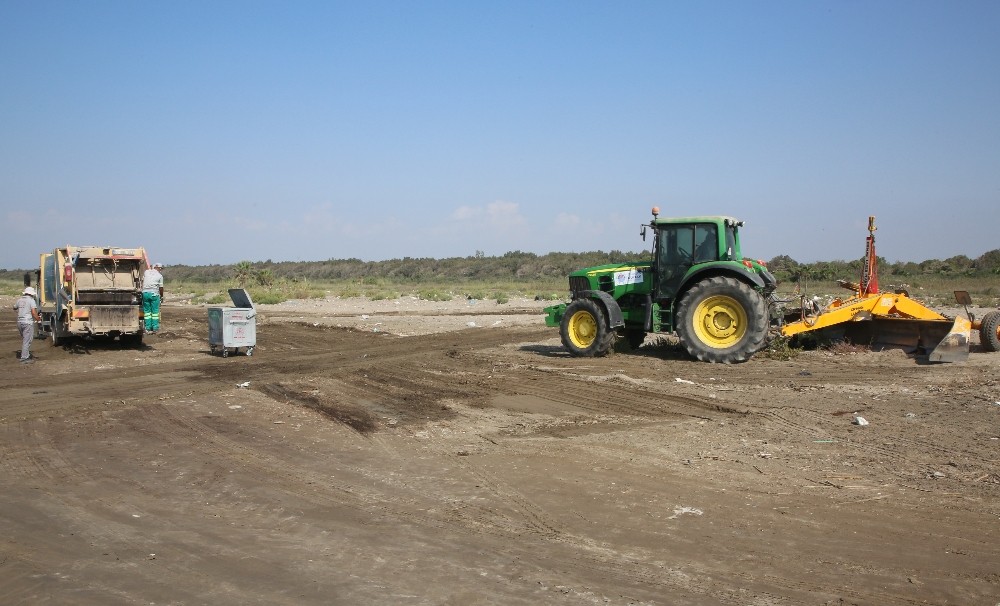 Adanalıoğlu sahilinin üst kesiminde, görevli ekipler tarafından lazerli plaj kumu eleme-temizleme makinesiyle sahilde bulunan tonlarca kum elenerek, biriken her türlü çöp ve atık temizlendi. Toplanan onlarca tonluk atık, yine iş makineleri yardımıyla kamyonlara yüklenerek çöp depolama alanına taşındı.