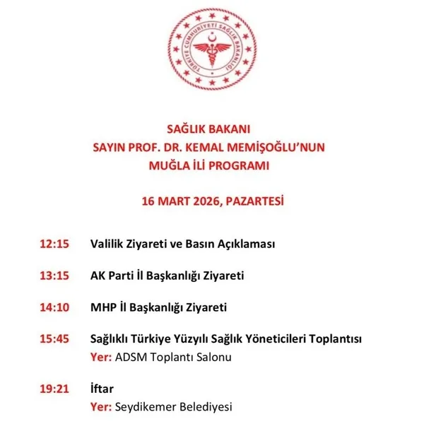 Sağlık Bakanı Prof. Dr. Kemal Memişoğlu'nun 16 Mart 2026 Pazartesi günü Muğla'da gerçekleştireceği program belli oldu.