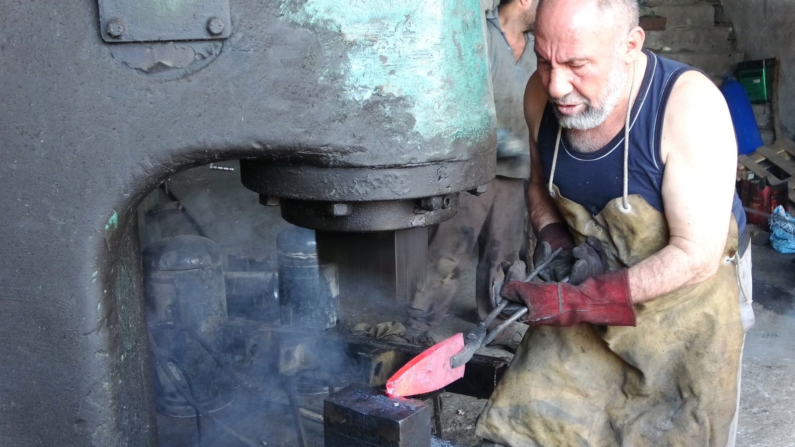 “İşimi severek yapıyorum” 40 yıldan bu yana demircilik yaptığını anlatan Mustafa Şefik, bu işi daha önce 50 yıl dedesinin, 50 yıl da babasının yaptığını söyledi. Bin 500 derece sıcaklığa ulaşan ocak başında zor şartlar altında çalıştığını ifade eden Şefik, “Dedem Orta Asya’dan buraya gelmiş. Kendim Azerbaycan uyrukluyum. İşimi severek yapıyorum. Ocağın içerisindeki ateş şu anda 1500 derece, dışarıdaki havada 40 derece sıcaklıkta. Buna rağmen durmadan çalışıyoruz. Gelen müşterinin ihtiyacına göre onların işlerini yapıp kendilerine veriyorum. 40 yıl önce bu sistem yoktu, körük vardı. Örs ve çekiçle gelen malzemeyi çekiçle şekillendirir, vatandaşa teslim ederdik. Çok zordu. Her seferinde 50-100 kilogram demiri fırına atarak ısıtıyorum. Isınan malzemeleri pres yardımı ve çekiçle şekillendiriyorum. Burada balta, kazma, traktör bıçağı, kültivatör bıçağı, kürüm bıçağı gibi her türlü demire şekil veriyorum” dedi.