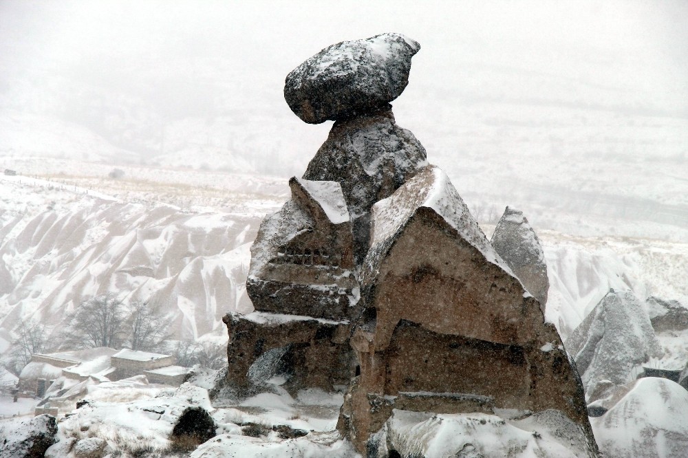 Türkiye’nin önemli turizm merkezlerinden Kapadokya bölgesinde mart ayında yağan kar ile peribacaları beyaza büründü.
