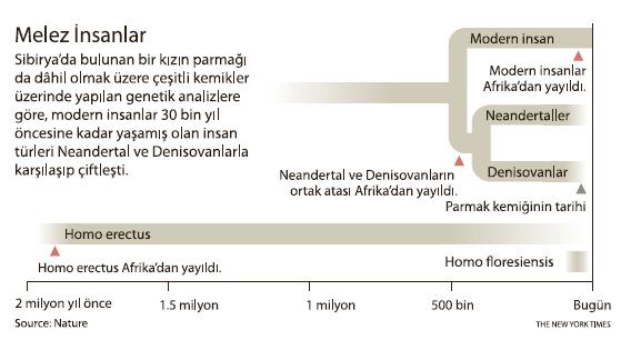 Küçük bir kızın Sibirya'daki bir mağarada bulunan pembemsi parmağının ucu, araştırmacıların insanın kökenine dair yeni ama karmaşık bir tablo oluşturmasını sağlıyor. Bu yeni tablo, modern insanların Afrika'yı 50 bin yıl önce terk edip soyu tükenmiş diğer tüm insan türlerinin yerine geçtiği fikrini çürütüyor. Genetik analizler, modern insanların aslında en a z i ki e ski i nsan g rubuyla karşılaşıp çiftleştiğini gösteriyor: Avrupa ve Asya'da yaşayıp yaklaşık 30 bin yıl önce soyu tükenen Neandertaller ve Asya'da yaşayıp aşağı yukarı aynı dönemde yeryüzünden silinen, Denisovanlar olarak bilinen gizemli bir grup. Genetik haritalama alanındaki ilerlemeler, Almanya'daki Max Planck Evrim Antropolojisi Enstitüsü'nde görevli araştırmacıların Neandertaller ve Denisovanların genom haritasını çıkarmasını sağladı. Denisovanlardan ilk olarak bir yıl önce, Nature dergisinde bahsedildi. Makale, mağaradaki kızın pembeleşmiş serçe parmağı kemiğinin ve genç bir yetişkinin tuhaf şekilli azı dişinin gen haritasının çıkarılması üzerine yazılmıştı. Genomları karşılaştıran bilim insanları, Afrika dışında yaşayan günümüz insanlarının ortalama yüzde 2.5 oranında Neandertal DNA'sı, Okyanusya'nın bazı kesimlerindeki insanlarınsa yaklaşık yüzde 5 oranında Denisovan DNA'sı taşıdığına kanaat getirdi. Kasım ayında yayımlanan bir makale, Güneydoğu Asyalıların, Neandertal genlerine ek olarak yaklaşık yüzde 1 oranında Denisovan DNA'sı taşıdığını ortaya çıkardı. Soyu tükenen üçüncü bir grup olan ve çok kısa boylu oldukları için "hobbitler" adı verilen Homo floresiensis, yaklaşık 17 bin yıl önce hâlâ yeryüzündeydi. Modern insanların onlarla çiftleşip çiftleşmediği bilinmiyor çünkü Homo floresiensislerin kalıntılarının bulunduğu Endonezya'daki Flores adasının sıcak ve nemli iklimi, DNA'nın bozulmadan korunmasını engelliyor. Harvard Tıp Okulu'ndan genetik bilimci David Reich'a göre dört milyon yıllık insan tarihinde sadece tek bir insan türünün hayatta olduğu tek çağ, içinde bulunduğumuz modern çağ. İnsanoğlunun kökeniyle i lgi l i tartışmanın merkezinde, bir kızın parmak kemiğinin keşfedildiği Sibirya'daki Altay Dağları'nda bulunan Denisova yer alıyor. Burası belki de üç insan türünün (Denisovan, Neandertal ve modern insan) farklı farklı dönemlerde de olsa aynı yerde yaşadığı gezegendeki tek bölge olabilir. Wisconsin-Madison Üniversitesi'nden paleo-antropolog John Hawks, mağarayı Temmuz'da ziyaret etti. Ortamın ortalama sıcaklığı 0 derece olduğu için, eski DNA'lar korunmuştu. Reich ve ekibi, yarı-Neandertal, yarıinsan karışımı az sayıda insanın 45 bin ila 67 bin yıl önce yaşadığına karar verdi. Yarı-Denisovan, yarı-modern insanlarsa daha yakın bir geçmişte yaşamıştı. Stanford Üniversitesi Tıp Okulu'ndan bağışıklık uzmanı Peter Parham, bağışıkl ık sisteminin genet ik bileşenleri üzerine bir analiz yaparak Denisovan-modern insan eşleşmesinin günümüzün güneydoğu Çin'i olan bölgede gerçekleştiğini keşfetti. Parham Neandertal ve modern insanın batı Asya'da çiftleştiğine dair de kanıtlara ulaştı. Parham'ın bulgularına göre Neandertaller ve Denisovanlar, modern insanların ortaya çıkmasından binlerce yıl önce Avrupa ve Asya'da yaşamış ve orada hastalıklarla mücadele etmenin yollarını bulmuşlardı. Modern insanlar, Neandertaller ve Denisovanlarla çiftleşince çok yararlı bir genetik bağışıklık maddesi vücutlarına girdi. Bu madde o kadar faydalıydı ki, günümüz insanlarının genomunda halen varlığını sürdürüyor. Antik çağlardan kalma bağışıklık sistemi bileşenlerinin dezavantajlarından biri, diyabet, romatizma ve multiple skleroz gibi hastalıklara yol açmış olma ihtimali. Denisovanların ne kadar kalabalık olduğu ve yeryüzünden nasıl silindikleri hâlâ gizemini koruyor. Reich, Denisovanların şu anda genlerden ibaret olduğunu ve bu insan türünün tarihini keşfetmeye çalıştıklarını söylüyor.