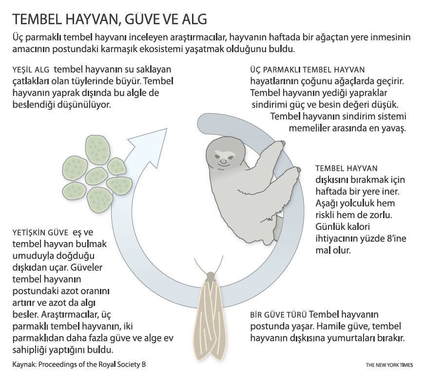 Üç parmaklı tembel hayvan, bir hayvandan çok yürüyen bir ekosistem gibi. Bu ekosistem üç parçadan oluşuyor: Tembel hayvanın kendisi, yalnızca tembel hayvan postunda yaşayabilen bir güve türü ve tembel hayvanın tüyleri arasında yetişen özel bir alg türü. Tembel hayvanın tüylerini taradığınızda yüzlerce güvenin uçuştuğunu görebilirsiniz. Bu üç unsurun etkileşimi Winconsin Üniversitesi'nden N. Pauli ve M. Zachariah Peery'nin liderlik ettiği bir biyolog ekibi tarafından araştırılıyor. Orta ve Güney Afrika'da yaşayan tembel hayvanların davranışlarındaki 35 yıllık gizem üzerine kafa yorarak i lk adımı att ı lar.Neredeyse her hafta, tembel hayvanlar dışkılamak için ağaçlarından inerler. Bir çukur kazar, pisliğin üzerini yapraklarla örter ve eğer şansları varsa tekrar yukarı tırmanırlar. Tembel hayvanlar yerdeyken korunaksızdırlar, ormandaki jaguarlar ve kakao ağacı çiftliklerindeki çakallar için ideal bir av olurlar. Tembel hayvanlar neden bu riski alır? 1978'de bu soruya dikkat çeken ilk araştırmacılar, tembel hayvanların ağaçları gübrelemek istediklerini öne sürdü. Bu sırada, tembel hayvanın postuna yeşilimsi bir renk veren alglerin de kamuflaj sağladığı tahmin ediliyordu. Wisconsin araşt ırmacı ları çok daha farklı bir sonuca ulaştı. Öncelikle tembel hayvanların neden her hafta bu tehlikeli tırmanışı yaptıklarını araştırmaya başladılar. Bunun ağacın yararına olamayacağı sonucuna ulaştılar. Çünkü tembel hayvanın dışkısı ağacın beslenmesinde herhangi bir değişikliğe yol açmıyordu. Bu tırmanışı, ekosistemin çok önemli bir parçası olan pyralid güvesi için yaptıkları sonucuna varıldı. Böylelikle tembel hayvanın postundaki güveler yumurtlama şansı elde ediyorlar. Güvelerin tırtılları kaprofajdırlar, yani dışkı yiyerek beslenirler. Tembel hayvanın dışkılarında gelişir ve yumurtadan çıkar; sonra da, bir tembel hayvan bulmak için ağaca çıkarlar. Postun içinde yaşayıp yaşamlarını sürdürürler. Öldükten sonra, vücutları post üzerindeki bakteri ve mantarlar tarafından ayrıştır ı l ır. Bu çürümenin metabolik ürünleri; özellikle de nitrojen, tembel hayvanın gövdesinde yaşayan özel algler için yiyecek kaynağıdır. Araştırmacı lar, tembel hayvanların post ları üzerindeki algleri yediklerini varsayıyorlar ve bunun bütün ekosistemin amacı olduğunu düşünüyorlar. Yapraklar besin yönünden fakir bir kaynaktır. Onlara bağl ı yaşayan gori l gibi hayvanların geniş bağırsaklara sahip olmaları gerekir. İnce dallar arasında tırmanan tembel hayvanların büyük bağırsakları yoktur. Çok yavaş hareket ederler çünkü kalorileri sayılıdır ve metabol izmala r ını yavaşlatmaya çalışırlar. Güve istilası ne kadar fazla olursa, üç parmaklı tembel hayvanın taşıdığı nitrojen ve alg sayısı da o kadar fazla olur. Tembel hayvanın karnında yapılan incelemede alg yedikleri tespit edilmiştir. Dışkı lar ını ağaçta yapan iki parmaklı tembel hayvanlar da, az sayıda da olsa güve barındırırlar. Yine de, tembel hayvan-güve-alg mutualizminde risksiz olarak fayda sağladıkları görülüyor. Dr. Pauli, Dr. Peery ile birlikte tembel hayvan projelerine 2009 yılında Kosta Rika'daki bir kakao ağacı tarlasında başladıklarını belirtti. Amaçları ise, tembel hayvanların asıl yaşadıkları ormanlar yok edi ldiğindeki kolonileşmelerini gözlemlemekti. Bazen genetik mühendisleri insanların kendi besinini fotosentez ile üretebilmesi için, insan derisine klorofil yerleştirme hayalleri kuruyor. Bu fikir muhtemelen milyonlarca yıl önce tembel hayvanların aklına gelmiş olmalı.