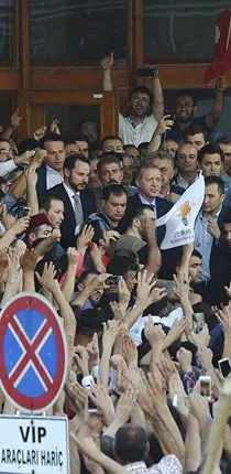 Darbe girişiminin ilk saatlerinde çeşitli televizyonlardan halkı meydanlara çağıran Erdoğan o tarihi konuşmasında şunları söylemişti: "Bu gelişme silahlı kuvvetlerimizin içindeki bir azınlığın ne yazık ki kalkınma hareketidir. Paralel yapının teşvik ettiği, üst akıl olarak onların kullandığı bir harekettir. Ülkemizin birliği, beraberliği, bütünlüğüne yönelik bu harekete karşı inanıyorum ki milletçe vereceğimiz güzel bir cevapla bunlar gerekli olan cezayı alacaklardır. Şu anda bu milletin imkânlarıyla ortaya konmuş olan tankı, topu, uçağı, helikopteri vs. kullanarak milletin üzerine gelmenin bedelini çok ağır ödeyeceklerdir. Meydanları onlara bırakamayız. Bu arada milletimi de bir çağrı yapıyorum. Milletimizi illerimizin meydanlarına, havalimanlarına davet ediyorum. Milletçe meydanlarda, havalimanlarında toplanalım. Bunların azınlık grupları tanklarıyla toplarıyla gelsinler, ne yapacaklarsa halka orada yapsınlar. Halkın gücünün üstünde bir güç ben tanımadım bu zamana kadar. Ben de başkomutan olarak meydanlara geliyorum." "bu işgal cilere ülkeyi bırakmayı z" İşte bu konuşmanın ardından halk meydanlara indi ve darbe girişimini püskürttü. Marmaris'ten İstanbul'a gelen Erdoğan, 16 Temmuz sabahı ise Atatürk Havalimanı'nda toplanan halka sesleniyordu. Erdoğan'ın hainlere korku veren konuşmasında şunları söylüyordu: "Bu vatana ihanet hareketinin bedelini en ağır şekilde ödeyecekler. Biz bu yola, bu kutlu davaya başımızı koymuşuz. Buraya bir canımızla kefenimizle bu yola çıkmışız. Türkiye de şu anda milletin oylarıyla seçilmiş bir iktidar vardır. Aynı şekilde milletin oylarıyla seçilmiş bir cumhurbaşkanı vardır. Bizler görevimizin başındayız sonuna kadar da bu görevimizi Allah'ın izniyle yürüteceğiz bu işgalcilere ülkemizi asla bırakmayacağız."