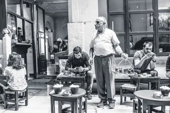 Ara Güler'in babasının eczanesinin de bulunduğu Beyoğlu'ndaki Hazzapulo Pasajı'nda, çay ocağının yanı başında üç arkadaş muhabbet ediyor. Belli ki derin mevzular konuşuluyor. Çaycı da ocakta pişen kahve ve yeni demlenmiş çayı servis etmeye hazırlanıyor. 66 yıl sonra Hazzapulo Pasajı'ndayız. 1983'ten beri burada çay ocağı işleten Mehmet Kayacan nam-ı diğer Mehmet Abi karşılıyor bizi. Elinde çay tepsisi servise çıkmış. Muhabbet yine var ama bu sefer yüz yüze değil. Telefondan...