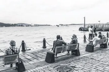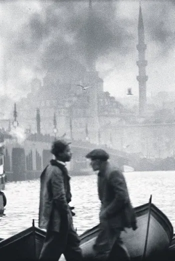 Ara Güler'in en bilinen ikonik fotoğraflarından biri. İki sandalcı Haliç'in başındaki sahilde arkalarına vapur dumanlarından kapanmak üzere olan Yeni Cami'yi almış muhabbet ediyor. 61 yıl sonra aynı yerdeyiz. Ama ne o sandalcılar var ne de o fotoğrafta görülen Galata Köprüsü... Yeni Galata Köprüsü biraz daha sağda kaldığı için kadrajımıza giremiyor. Fakat şöyle bir deniz havası almaya çıkan belki de balık ekmek yemeye giden iki arkadaş aheste aheste önümüzden geçiyor.