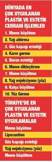 Turizm, zaman içinde çok çeşitlendi ve en çok öne çıkan türlerinden biri de sağlık turizmi oldu. Sağlık turizminin çoğunluğunu ise estetik turizmi oluşturuyor. Estetik turizminin, sağlık turizminde olduğu gibi genel turizmdeki payı da her geçen yıl artıyor. Son 10 yılda büyük gelişme sağlayan estetik turizmi, 10 milyar doların üzerinde bir rakama ulaştı. 10 milyar dolarlık pastadan en çok pay alan ülkelerden biri de Türkiye. Türkiye estetik turizmi konusunda son 10 yılda dünyanın en önemli ülkeleri arasına girdi ve şu anda dünyada yedinci sırada yer alıyor. Rakiplerimiz ise; sırasıyla Amerika, Brezilya, Japonya, Meksika, İtalya ve Almanya. 110 ülkeden 25 bin estetik cerrahın üye olduğu Uluslararası Estetik Plastik Cerrahlar Birliği'nin (ISAPS) verilerine göre bir yılda dünyada 11 milyon 363 bin 569 plastik cerrahi operasyon, 13 milyon 618 bin 735 adet cerrahi olmayan estetik operasyon yapıldı. Türkiye'de ise cerrahi ve cerrahi olmayan toplam 754 bin 392 estetik operasyon gerçekleştirildi. Bunun 351 bin 930'unu cerrahi işlem gerektiren operasyonlar, 402 bin 462'sini ise ameliyatsız operasyonları içeriyor. Türkiye'de yapılan plastik cerrahi operasyonlarının 161 bin 298 yüz ve kafa bölgesine, 84 bin 231'i vücudun değişik bölgelerine, 72 bine yakını memelere ve 3 bin 496'sı göz kapağına yapıldı. Geri kalanlar ise liposuciton, yağ aşılama gibi işlemler. Cerrahi işlem gerektirmeden yapılan en yaygın uygulama ise botoks oldu, botoks rakamı 200 bine yaklaştı. Botoksu cilt bakımı, tüy alma ve lazer uygulamaları izledi. Türkiye'deki bu estetik işlemlerinin büyük çoğunluğu estetik turizminden yani yurt dışından gelenlerden kaynaklanıyor. Çünkü güzelleşmek için ülkemize gelen yabancı turistlerin sayısı yıllık 600 binin üzerinde. Türkiye'ye en çok Avrupa ülkeleri, Ortadoğu ve Rusya'dan güzelleşmeye geliyorlar. Avrupa'dan güzelleşmeye gelenler arasında birinci sırada ise Almanlar yer alıyor.