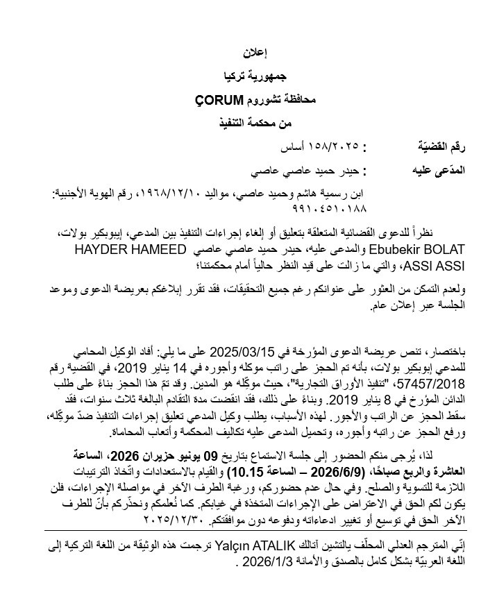 Davacı , EBUBEKİR BULAT ile Davalı , HAYDER HAMEED ASSI ASSI arasında mahkememizde görülmekte olan Takibin Taliki Veya İptali davası nedeniyle;