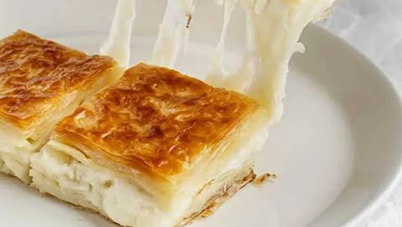 YAPILIŞI: Öncelikle hamurunu hazırlıyoruz. Hamurunu hazırlamak için altı adet orta boy yumurta, bir su bardağı su, bir çay bardağı sıvı yağ ve tuzu derin bir kap içerisinde karıştırıyoruz. Elde ettiğimiz karışımın üzerine azar azar ölçülü olarak un ilave edip güzelce yoğurarak orta sertlikte bir hamur elde ediyoruz. Yoğurduğumuz hamurun üzerini temiz bir bez ile örtüp 10 dakika dinlendiriyoruz. Büyük bir tencerede su kaynatıyoruz. 150 gram tereyağını tavada eritip soğutuyoruz. Dinlendirdiğimiz hamuru düz bir zemin üzerine alıp eşit şekilde dört parçaya bölüyoruz. Daha sonra her parçayı dört eşit parçaya bölerek beze yapıyoruz ve toplamda 16 beze elde ediyoruz. Bezeleri unlu zemin üzerinde merdane yardımı ile açıp büyütüyoruz. Üzerine hafif un serpiştirerek oklava yardımı ile inceltmeden açıyoruz. Fırın tepsisini, eritilmiş tereyağı ve sıvı yağ karışımı ile yağlıyoruz. Kaynayan suyun içerisine tuz ve bir yemek kaşığı sıvı yağ ilave ediyoruz. Derin bir kaba soğuk su dolduruyoruz. Bir adet yufkayı, kaynamakta olan tuzlu su içerisine bırakıyoruz. Sıcak su içerisinde 20 saniye beklettiğimiz yufkayı, daha sonra kevgir yardımı ile çıkarıp hemen soğuk su içerisine bırakıyoruz. Yufkayı soğuk su içerisinden çıkarıp suyunu süzüyoruz. Haşladığımız yufkayı yağlı fırın tepsisine büzdürerek yerleştiriyoruz ve üzerine eritilmiş tereyağı sürüyoruz. Sekiz adet yufkayı aynı şekilde tek tek haşlayıp aralarına tereyağı sürerek büzdürüp üst üste seriyoruz. Tepsiye sekiz yufka serdikten sonra, üzerine peynir serpiştiriyoruz. Diğer yufkalarda aynı şekilde haşlayıp aralarına tereyağı sürerek üst üste seriyoruz.