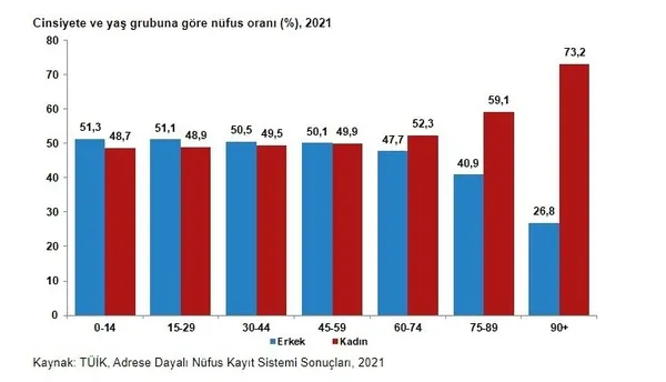 Adrese Dayalı Nüfus Kayıt Sistemi (ADNKS) sonuçlarına göre; 2021 yılında, kadın nüfus 42 milyon 252 bin 172 kişi, erkek nüfus 42 milyon 428 bin 101 kişi oldu. Diğer bir ifadeyle; toplam nüfusun %49,9'unu kadınlar, %50,1'ini ise erkekler oluşturdu. Kadınlar ile erkekler arasındaki bu oransal denge, kadınların daha uzun yaşaması nedeniyle, 60 ve daha yukarı yaş grubundan itibaren kadınların lehine değişti. Kadın nüfusun oranı, 60-74 yaş grubunda %52,3 iken 90 ve üzeri yaş grubunda %73,2 oldu.