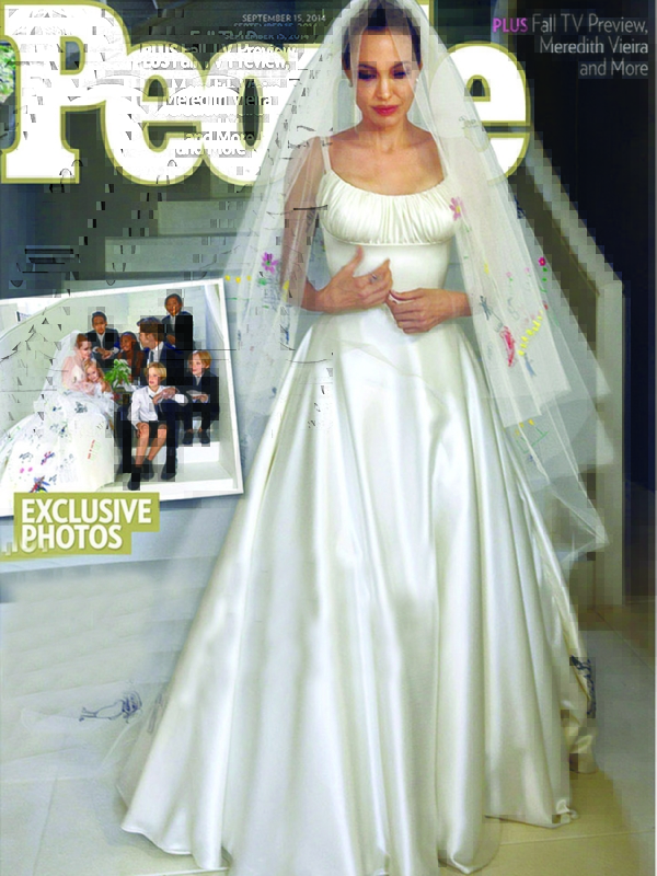 Hollywood'un en güzel çiftlerinden Angelia Jolie ve Brad Pitt, 23 Ağustos 2014'te Fransa'nın güneyinde düzenlenen özel bir törenle nikah masasına oturdu. Muhtemelen son on yılın en çok beklenen evliliklerinden biriydi. Jolie'nin gelinliği aslında 6 çocuğunun yaratıcılığının ifadesiydi. Atelier Versace tasarımcılarından ipek gelinliği ve duvağının üzerini çocuklarının yaptığı onlarca rengarenk çizimlerle kaplamalarını istedi. İşte moda tarihinin en ikonik ve zarif gelinliklerinden biri.