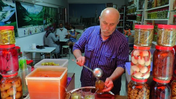 Kayseri'de yumurta, muz, hamsi gibi 85 çeşit turşu ile hizmet veren turşucu Bayram Ali Aydoğan, "Şu anda dükkanımızda 85 çeşit turşu var. En fazla rağbet gören ürünlerimiz, acılı turşu suyu ve kozalak turşumuz. Kozalak turşusu suyu, astım, nefes darlığına ve öksürüğe iyi geliyor. Kozalak turşusu suyu koronavirüse yakalanan müşterilerimizin de tercih ettiği bir ürün.