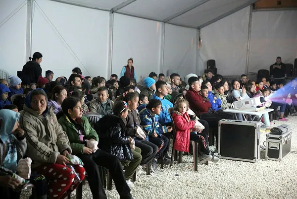 Çadır kentte kalan çocukların yüzlerini güldürebilmek için gündüzleri tiyatro sahneleniyor akşamları ise çizgi film gösterimi yapılıyor. İkram edilen mısır eşliğinde "Kral Şakir" çizgi filmini izleyen çocuklar, bir nebze de olsa depremin etkisinden uzaklaştı.