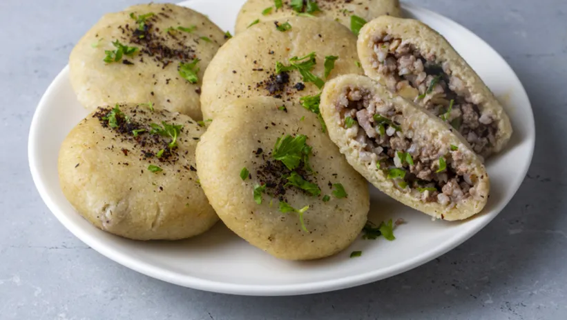 Elinizi ıslatarak hamurları açın ve ortasına 1 tatlı kaşığı iç harç koyun.