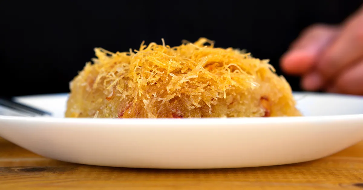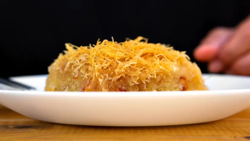 Kadayıfları geniş bir tepsiye alın ve tereyağını üzerine gezdirerek dökün. Eliniz ile alttan üste doğru fazla ezmeden ve kırmadan karıştırın ve yağın kadayıfların her tarafına eşit şekilde dağılmasını sağlayın. Kadayıfların yarısını kalıbın içine yerleştirin ve üzerine cevizleri yayın. Üzerine kalan kadayıfı yerleştirin ve pişirin.