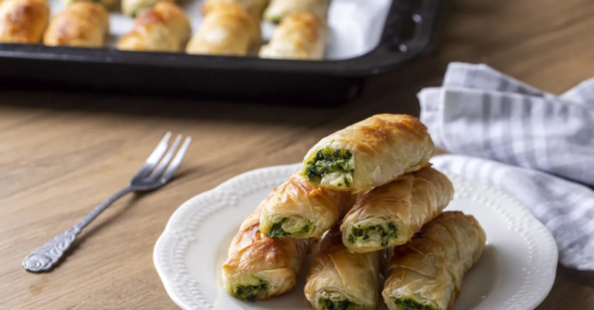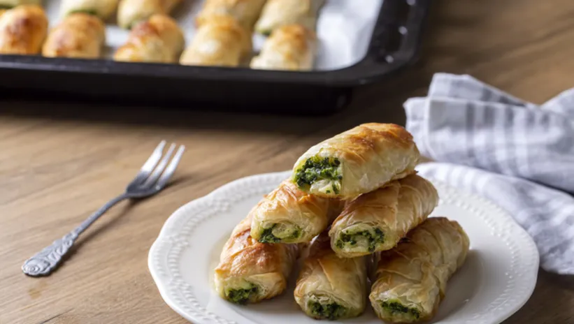 - Yufkaları rulo şeklinde sarın ve yağlı kağıt serili tepsiye yerleştirin.