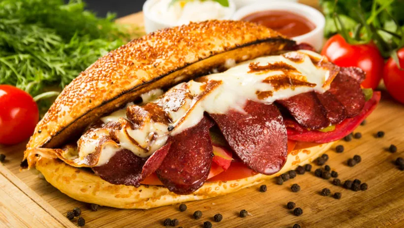 Ekmeğin alt kısmına dilimlenmiş domates, yeşil biber ve ardından sucuk ve pastırmayı yerleştirin.