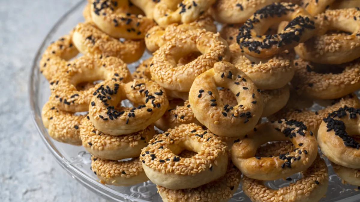 Halka kurabiyeleri önce yumurta beyazına, sonra susama veya çörek otuna bulayın.