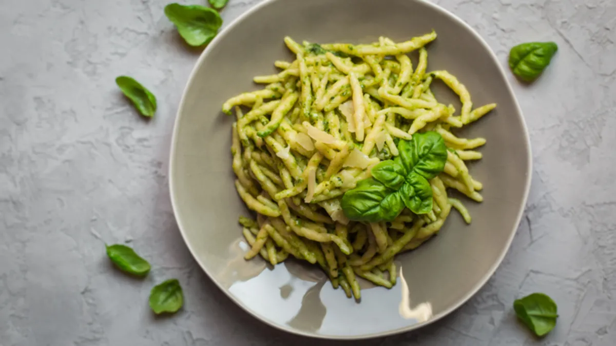Fesleğen, sarımsak,zeytinyağı ve ayırdığınız bir kepçe makarna suyunu mutfak robotundan geçirin.