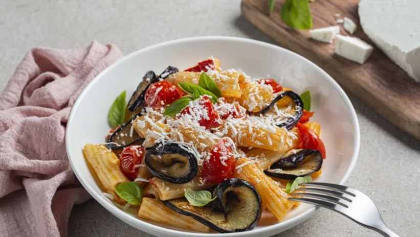 Kızarmış patlıcanları sosun içine ekleyin ve 1-2 dakika daha pişirin. Son olarak haşlanmış makarnayı ekleyip sosla iyice karıştırın. Üzerine fesleğeni ekleyin. Makarna tabaklara alın ve üzerini rendelenmiş peynirle süsleyin. Sıcak servis yapın. Afiyet olsun.